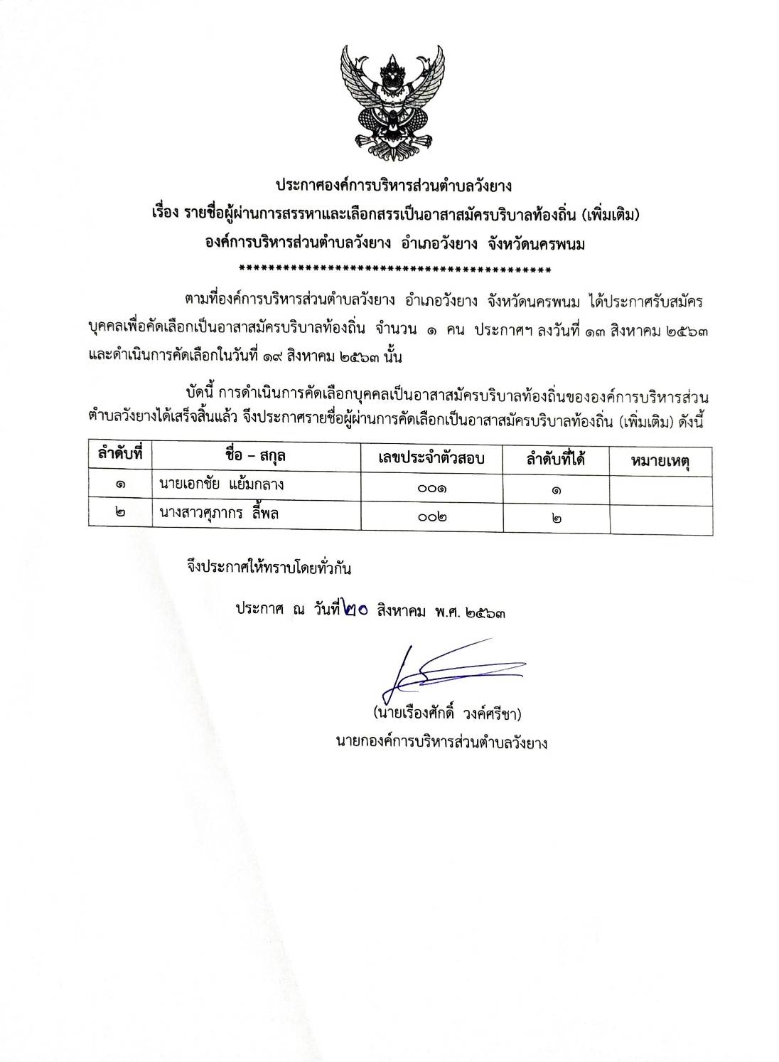 ประกาศองค์การบริหารส่วนตำบลวังยาง เรื่อง รายชื่อผู้ผ่านการคัดเลือกเป็นอาสาสมัครบริบาลท้องถิ่น (เพิ่มเติม)
