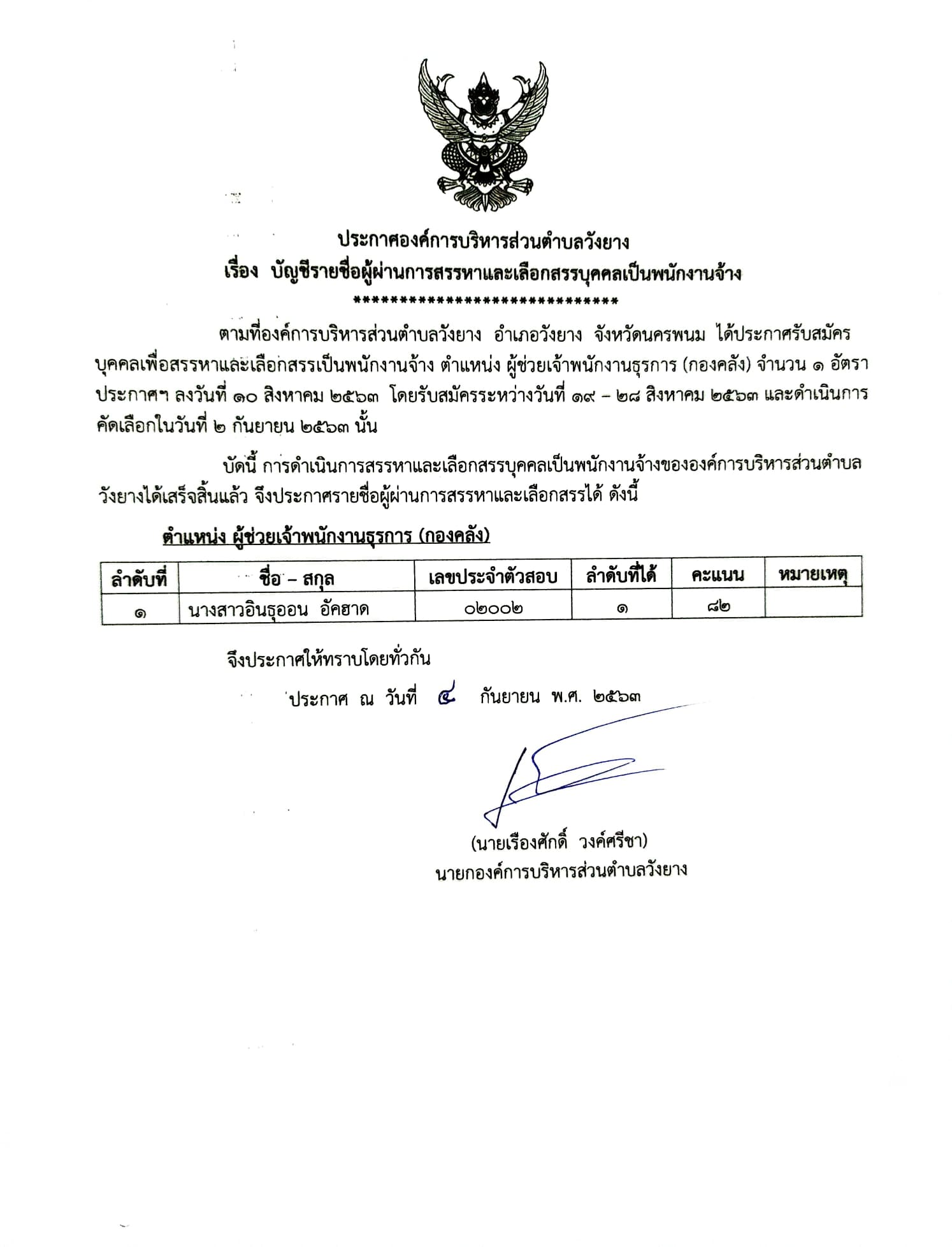 ประกาศองค์การบริหารส่วนตำบลวังยาง เรื่อง บัญชีรายชื่อผู้ผ่านการสรรหาและเลือกสรรบุคคลเป็นพนักงานจ้าง
