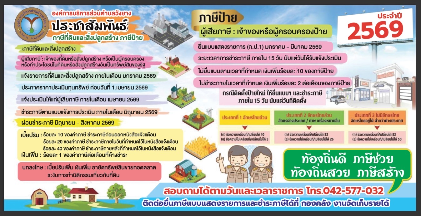 ประกาศประชาสัมพันธ์การจัดเก็บภาษีที่ดินและสิ่งปลูกสร้าง ภาษีป้าย ประจำปี 2569